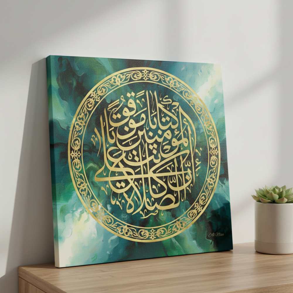 This stunning artwork masterfully unites traditional Islamic calligraphy with contemporary abstraction. The central focus is the intricate calligraphic script, rendered in luminous gold against a swirling field of deep greens, aquamarine, and touches of white, suggesting a lush, ethereal garden or powerful moving waters. The calligraphy is framed within a delicate, golden ornamental motif, grounding the energetic background. This piece is more than just decoration; it is a meditative and inspiring focal point. It employs a rich, jewel-toned color scheme that imparts a feeling of tranquility, sophistication, and reverence, making it an elegant statement piece for a living area, study, or office. The visual emphasis is on the grace and complexity of the script itself, presenting a timeless message enveloped in a truly modern work of art.